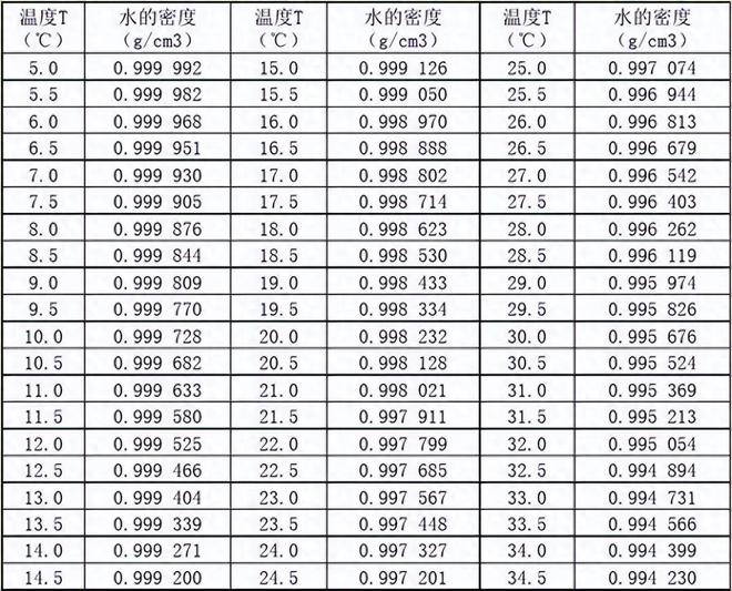 因為我們在計算時犯了一個常識性的錯誤,默認水的密度為1g/cm3。在精密計算時,這是不可忽略的因素,下表為不同溫度下的水密度,我們?nèi)≈?.997074。