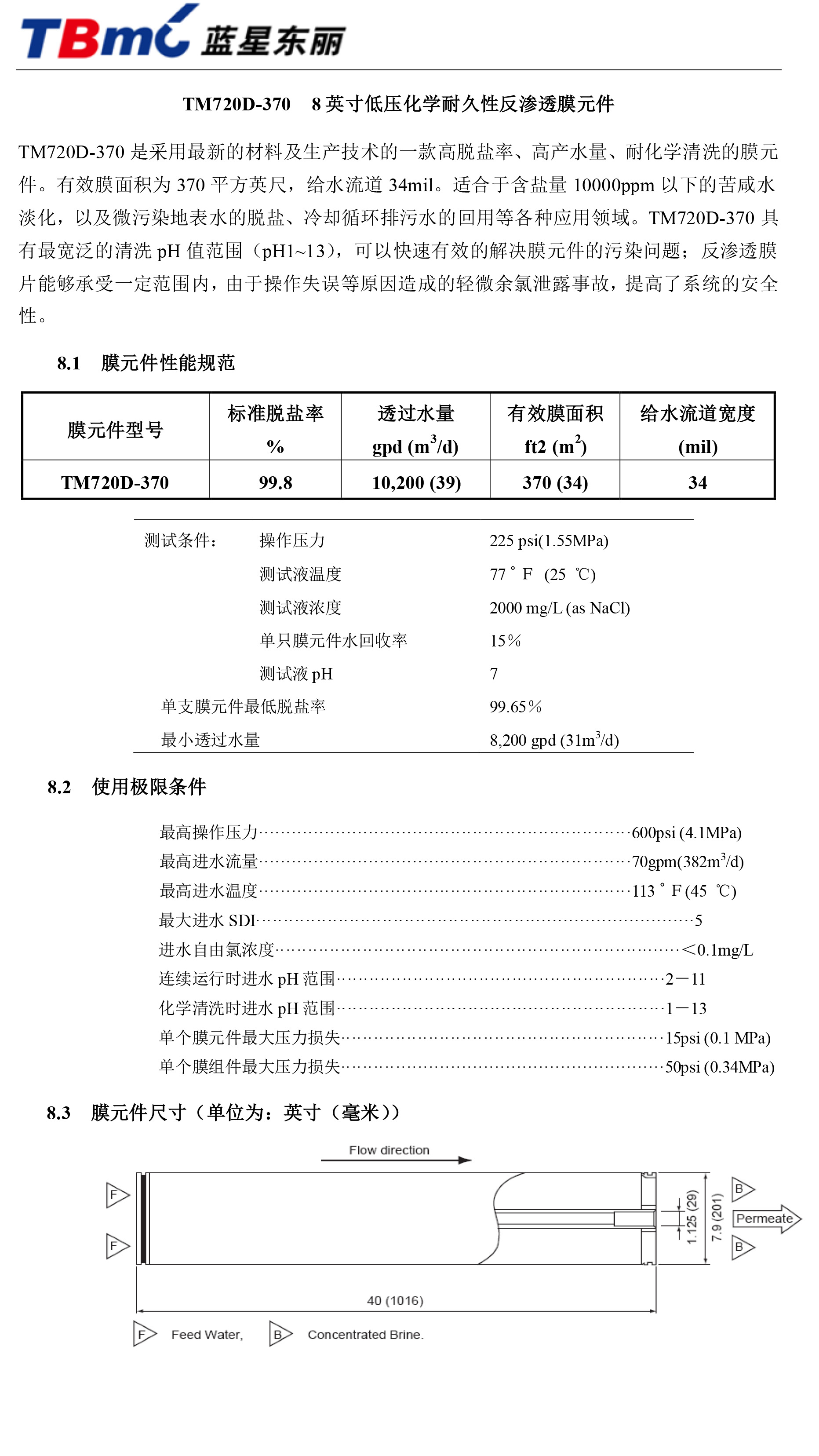 TM720D-370 是采用最新的材料及生產(chǎn)技術(shù)的一款高脫鹽率、高產(chǎn)水量、耐化學(xué)清洗的膜元 件。有效膜面積為 370 平方英尺,給水流道 34mil。適合于含鹽量 10000ppm 以下的苦咸水 淡化,以及微污染地表水的脫鹽、冷卻循環(huán)排污水的回用等各種應(yīng)用領(lǐng)域。TM720D-370 具 有最寬泛的清洗 pH 值范圍(pH1~13),可以快速有效的解決膜元件的污染問(wèn)題;反滲透膜 片能夠承受一定范圍內(nèi),由于操作失誤等原因造成的輕微余氯泄露事故,提高了系統(tǒng)的安全 性。