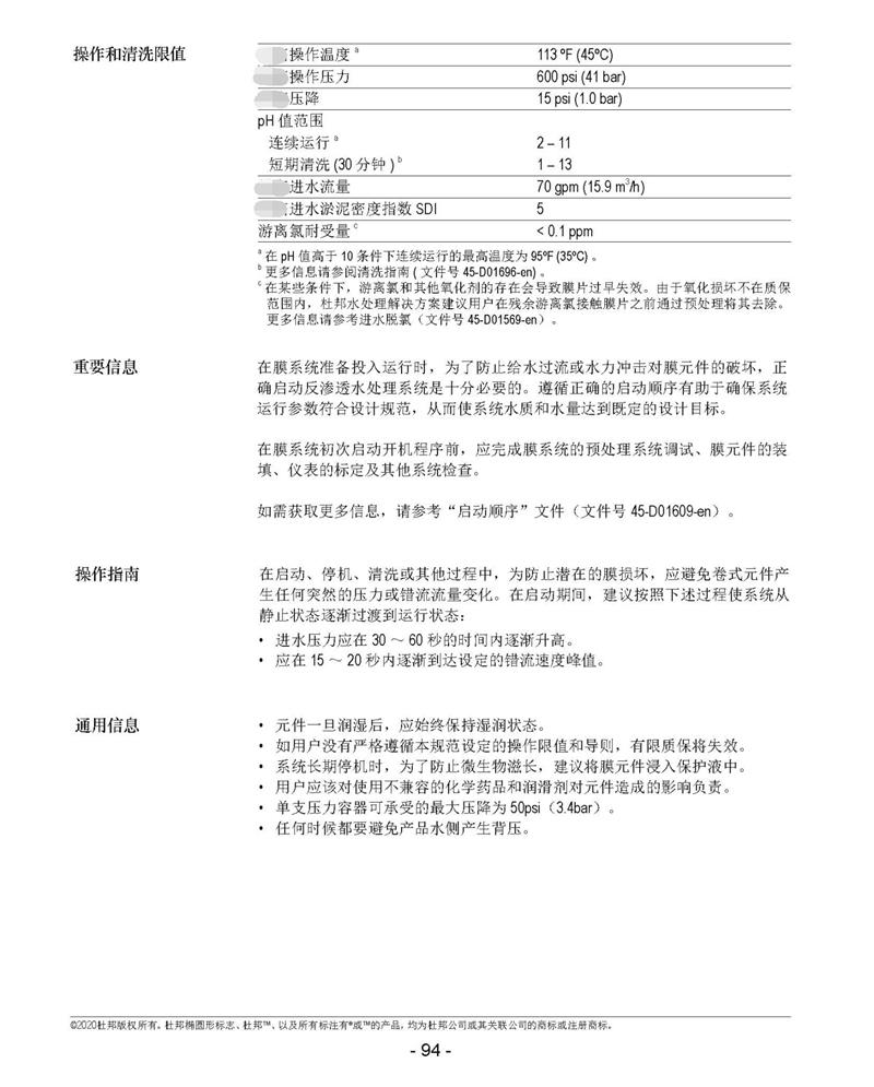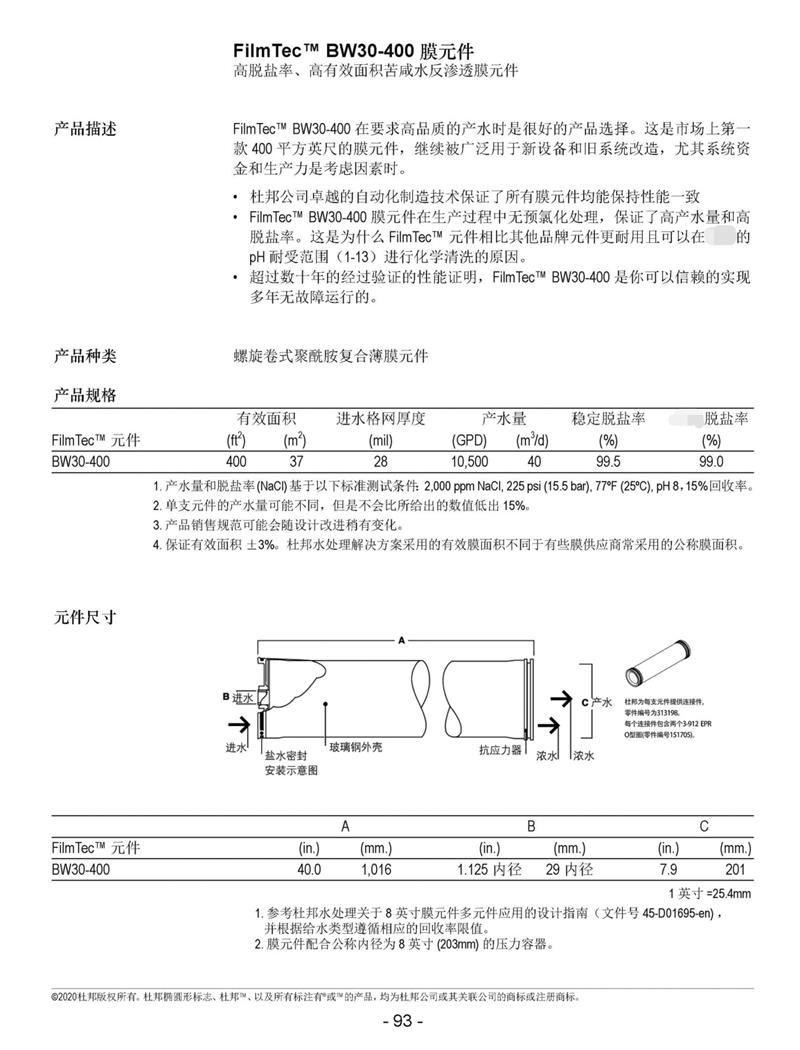 【陶氏BW30-400】基本說明 產(chǎn)品名稱:反滲透膜 英文名稱:FILMTEC? Menbranes 產(chǎn)品材質(zhì):聚酰胺復合膜 產(chǎn)品型號:BW30-400 品牌:陶氏DOW 運行壓力:<4.1Mpa 產(chǎn)水量:40噸/天 穩(wěn)定脫鹽率:99.5% 產(chǎn)地:美國 重量(毛重):12.3KG 包裝盒規(guī)格:1060mm*220mm*210mm